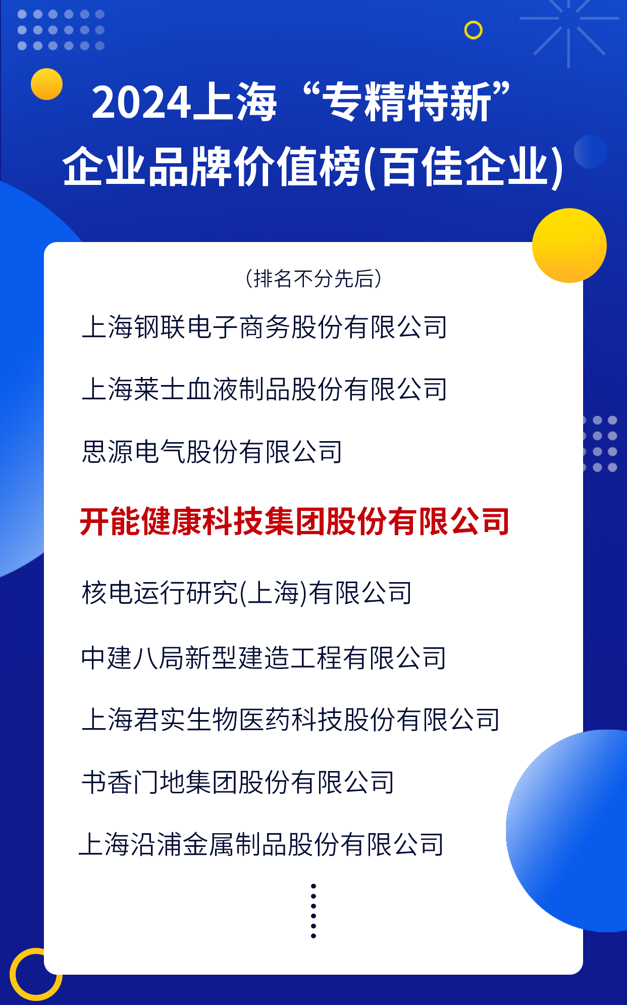 開能健康榮登上海專精特新企業(yè)品牌價值榜(百佳企業(yè))